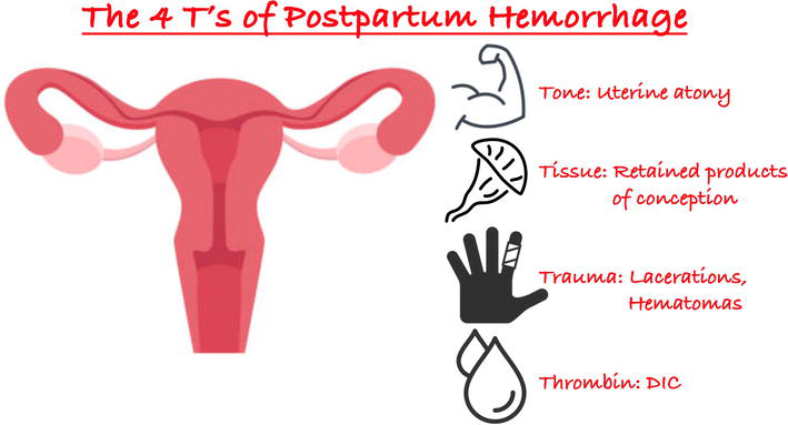 “Four Ts” mnemonic — causes of PPH: Tone, Trauma, Tissue, Thrombin (uterine atony, genital tract injury, retained tissue, coagulopathy)